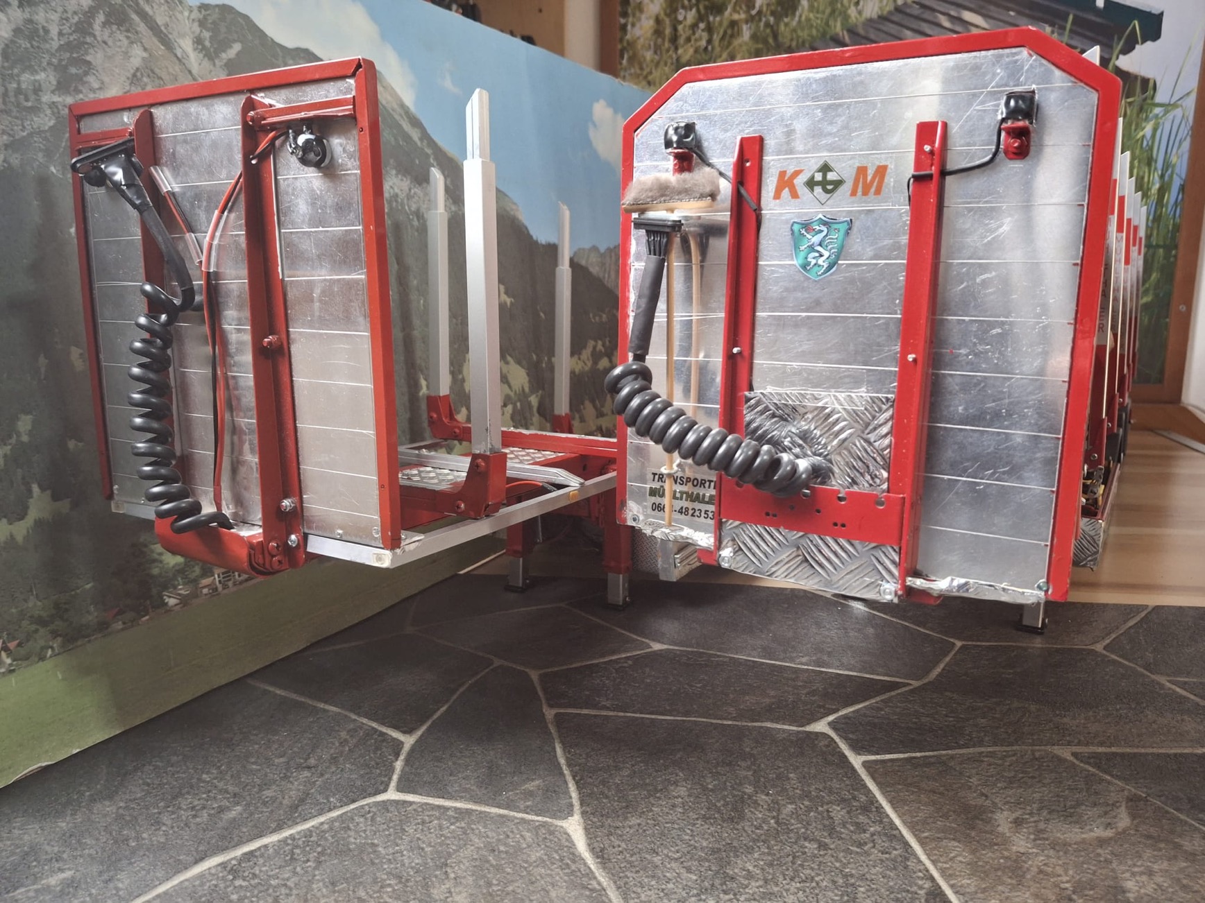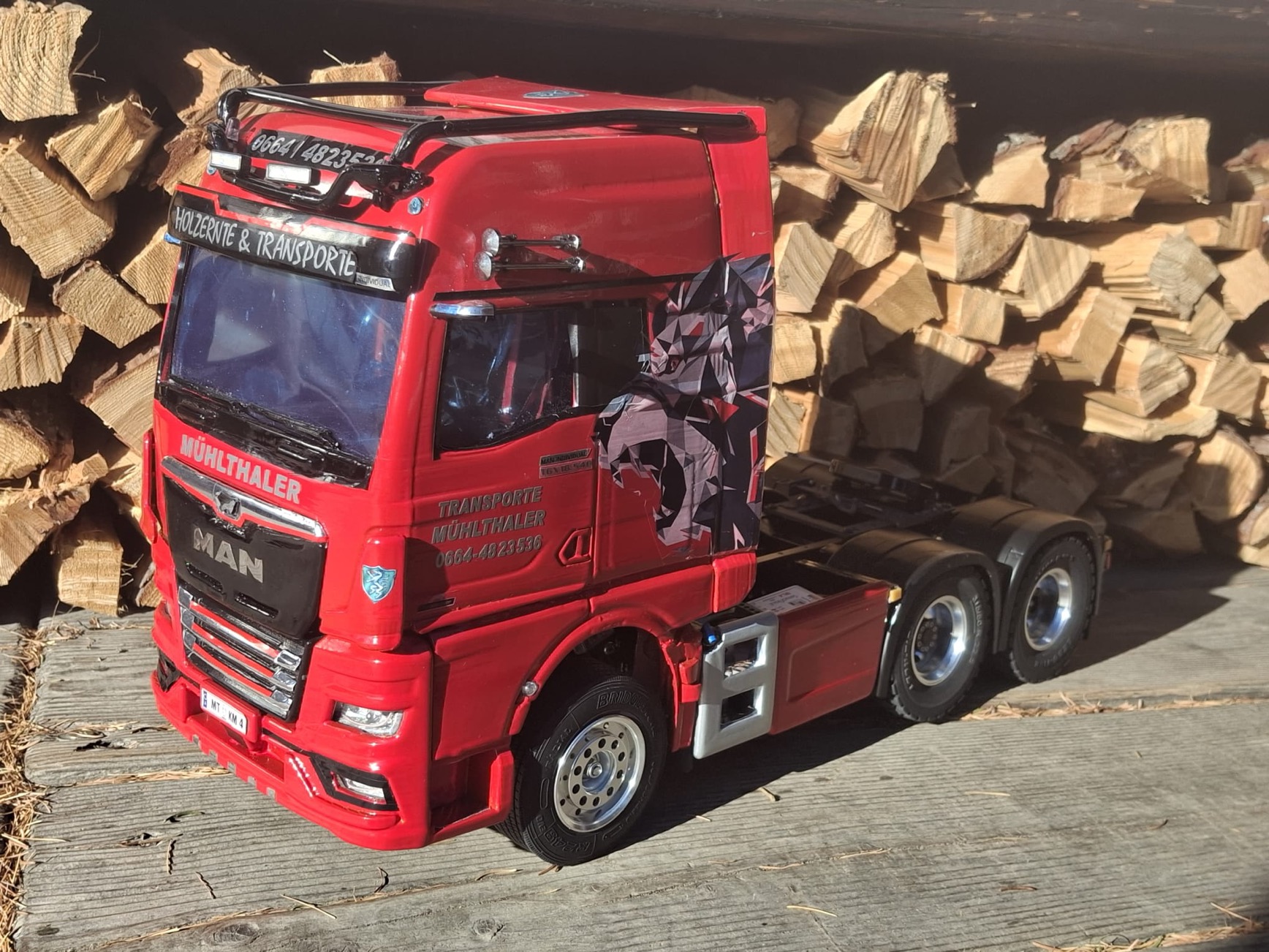Die Umsetzung dieses Modells erforderte ein Jahr intensiver Arbeit. Während der Bauphase galt es, zahlreiche Herausforderungen zu bewältigen. Eine der größten bestand darin, ein geeignetes Fahrerhaus aus China zu beschaffen und die Lieferung reibungslos zu koordinieren. Ebenso anspruchsvoll war die Suche nach einem passenden Löwendesign sowie die Auswahl eines Beschriftungsunternehmens, das dieses Design in höchster Qualität umsetzen konnte. Herr Mühlthaler spricht der Firma Format Orange seinen besonderen Dank aus, die stets mit erstklassigen Beschriftungen überzeugt.