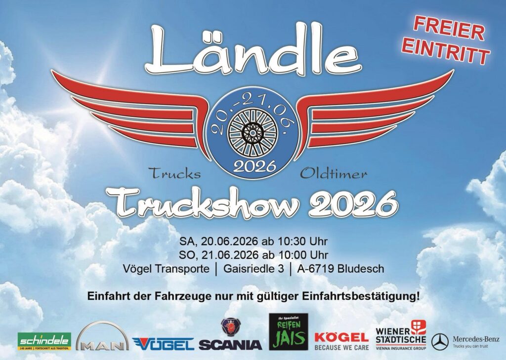 Am 20. und 21. Juni 2026 verwandelt sich das Firmengelände der Fa. Vögel Transporte in Bludesch wieder in einen Hotspot für Truck‑Fans. Zwei Tage lang erwarten die Besucher eine umfangreiche Lkw‑ und Oldtimer-Ausstellung, zahlreiche Branchenaussteller, Livemusik und ein abwechslungsreiches Rahmenprogramm für die ganze Familie. Auch der Commander Club wird mit einem Stand vertreten sein und freut sich auf euren Besuch!